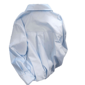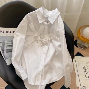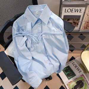 ブルーポロカラーバックルボウシャツ女性のための 2025 春と秋の新しいデザインニッチ長袖シックなシャツ