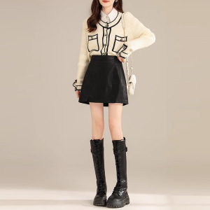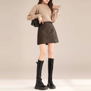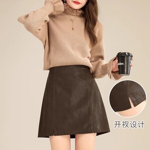 超人気の女性用スモールレザースカートとショートスカート2025秋の新しいハイウエストAライン秋冬スカートPUブラウンヒップカバースカート