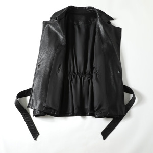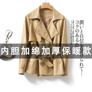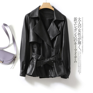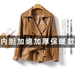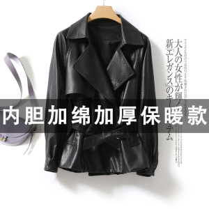 海寧綿羊皮の短い女性のコートは腰の本革の女性2025年の春と秋の新商品の韓国版の黒い皮の服の女性を結びます。