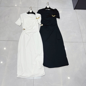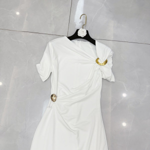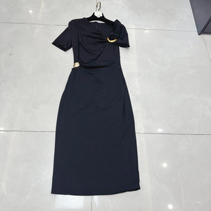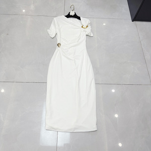 十三行フレンチ斜め襟半袖メリヤス金属ボタン装飾デザイン感フレンチ気質ワンピースC1 #1612