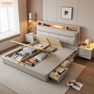 高級生態皮ベッド現代シンプル主臥大ベッドクリーム風真皮ベッド1.5メートル二人気圧引き出し付き