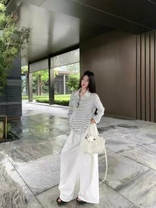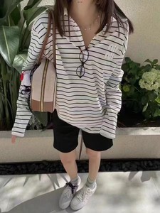 24ss新型ファッションシンプル学院風アルファベット布白い縞ポロシャツ長袖ゆるいtシャツ上着