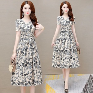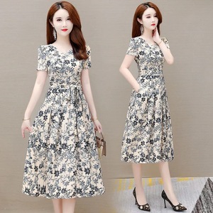 アイスシルク花柄 V ネックレースアップ半袖ミドル丈ドレスレディース夏の新スリムホールコットンカジュアルスカート