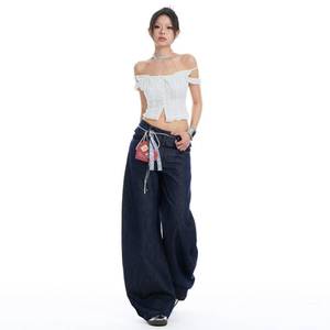 批发木耳边双腰头美式辣妹***弯刀裤设计水洗百搭显瘦牛仔