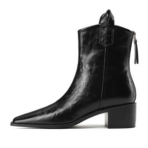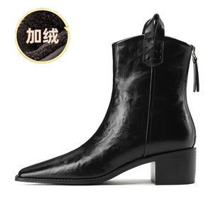 776-10欧美风显瘦短靴复古手抓纹女靴子粗跟中跟骑士靴尖头短筒靴