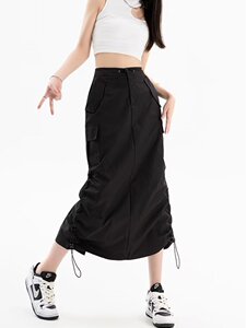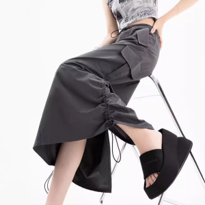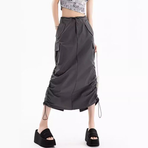 アメリカントレンディホットガール速乾性プリーツ巾着ワークスカート夏レトロルーズカジュアルストレートバックスリットスカート