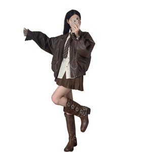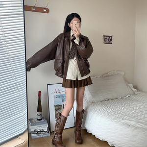 安可拉红皮衣短外套女学生春秋新款美式复古棒球服皮夹克上衣