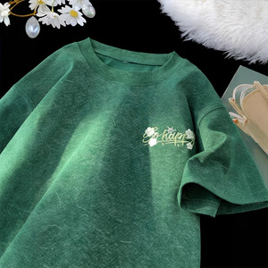 240 グラムヘビーウェイトサンドウォッシュアイスシルク半袖 Tシャツボーイズ夏のトレンディなブランド刺繍テンセル半袖ルーズラウンドネック Tシャツ
