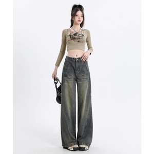 春夏の女性用アメリカンスプライスジーンズ、ハイストリートデザイン、フロアレングスワイドレッグパンツ、レトロウォッシュ、多用途パンツ、トレンディ