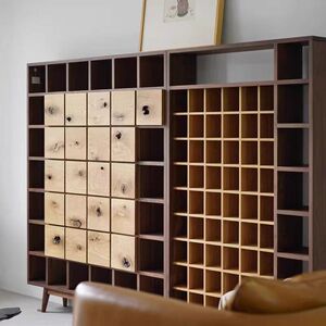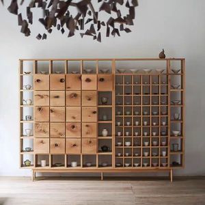わびさびスタイルの古いニレ材の棚、正方形の格子のティーカップ棚、リビングルームのディスプレイキャビネット、ティールームのティーポットラック