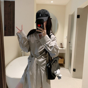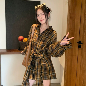 2025 春夏新レトロポロ襟チェック柄長袖シャツスカートジャケット女性のミッドレングススリムカジュアルライナー
