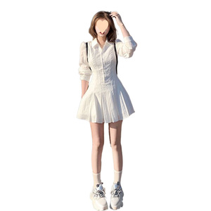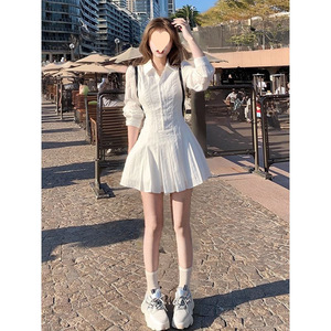 学院风白色长袖衬衫连衣裙女收腰气质设计感领百褶中裙子2025春季