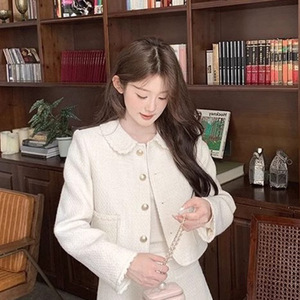 リッチガールの香りのツーピーススーツ、女性用、ハイエンド、軽い高級感、ベビードールカラー、ショートコート、スカート