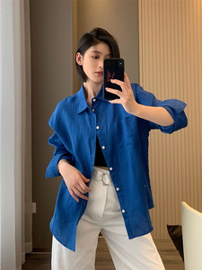 红人同款 !2025新群青100亚麻法式透气老钱风口袋翻领长袖衬衫女