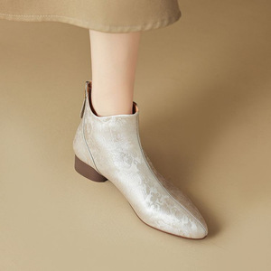 新中式国风尖头软皮低跟短靴女2025春秋新款洋气花朵女靴子