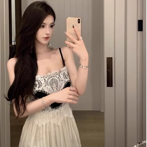 女性用のヘビーレースステッチの大きな裾スカート、黒と白のコントラストカラーのウエスト痩身サスペンダードレス、ロングスカート、休暇用のスーパーフェアリー