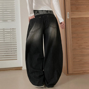 25秋新作 韓国風 個性派 ウォッシュ加工 ホワイトカラーブロック レターデザイン ルーズフィット バウンドカットデニムパンツ レディース ワイドレッグパンツ