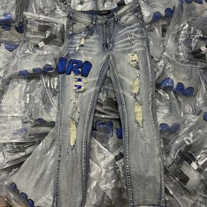 AM ヨーロッパとアメリカのトレンディなブランド春と秋の乞食の穴レターパッチワークレザー刺繍スリムジーンズメンズトレンディな小足ズボン