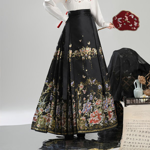華麗な中国のプリント黒馬スカート + クロスカラートップ + 白サスペンダー
