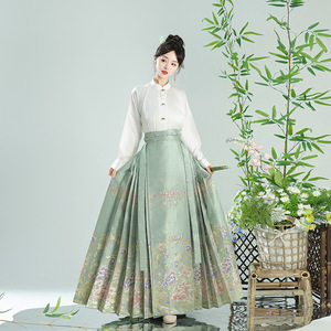 華麗な緑の金織馬面スカート + 白のトップ + ピンクの雲肩