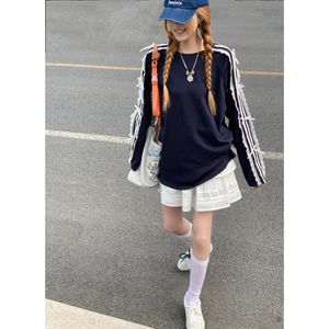 レースストライプリボン長袖Tシャツレディース夏韓国風カジュアルルーズミドル丈デザイントップ