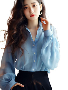ファッションレトロ気質香港風ブルーシフォン長袖シャツ女性春の新作