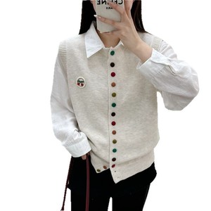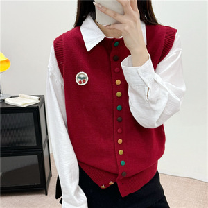 カラーボタンさくらんぼ刺繍ニットベスト女性2025春秋新商品ゆるい重ね着ノースリーブセーター馬クリップ