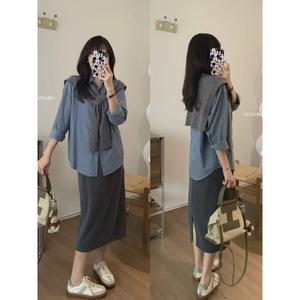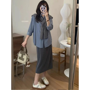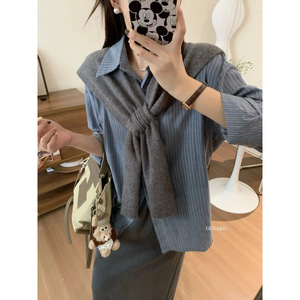 2025春秋韩系通勤套装法式气质长袖条纹衬衫衬衣叠穿披肩女两件套