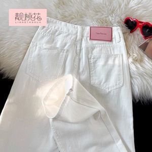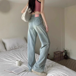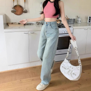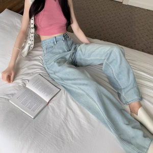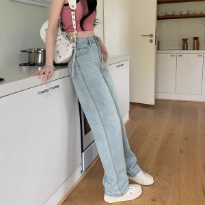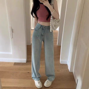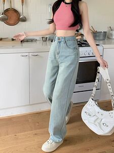 浅色高腰牛仔裤女春秋新款直筒百搭设计感小众遮肉显瘦阔腿长裤潮