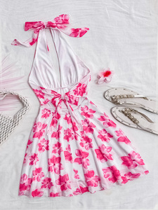 レディース ホリデー フェスティバル ピンク 花柄 Vネック バックレス タイウエスト フリル Aライン ミニドレス
