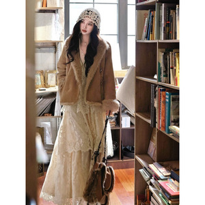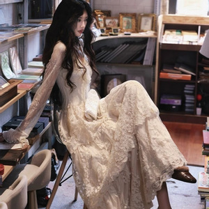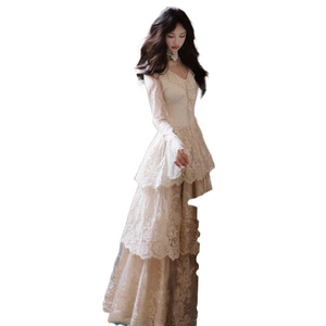 法式复古轻婚纱蕾丝蛋糕裙重工V领连衣裙气质打底长款长裙大裙摆
