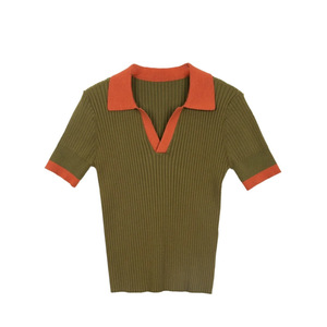 法式复古撞色领针织短袖正肩体恤女显瘦修身高级感夏季上衣