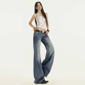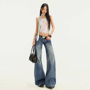 批发复古水洗蓝牛仔裤春夏季美式高街低腰宽松直筒拖地裤