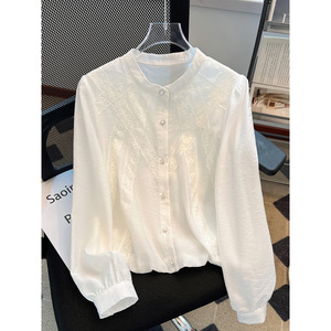 フランスの白いシャツの女性の高級感の春の2025新型の超美しいレースの長袖の美しいシャツの上着
