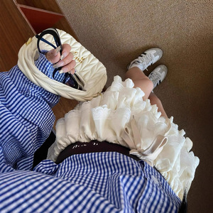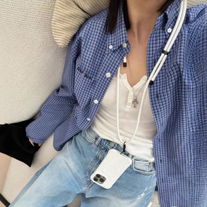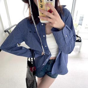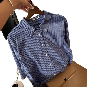 mi*u ファインブルーチェック柄レイヤードキングシャツ刺繍小bレディース春夏韓国風レイヤードスリムブルー長袖シャツ