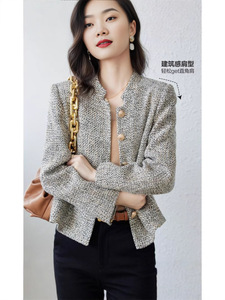 小香風コートの女性は太いですね。2025秋冬の新型通勤スタンドカラーのデザイン感があります。