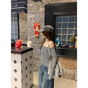 韓国版スリムフィットワンショルダー長袖Tシャツ2025春新作カラーブロックストライププルオーバートップ女性用