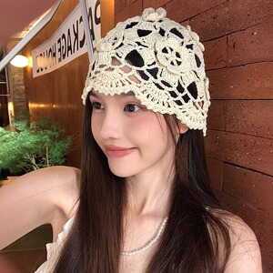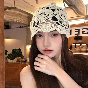 手工钩花针织堆堆帽女春夏时尚百搭可爱套头帽薄款透气镂空包头帽