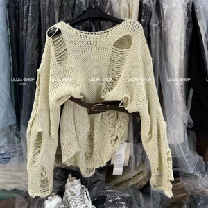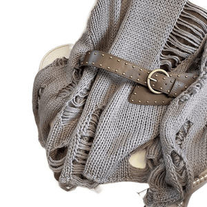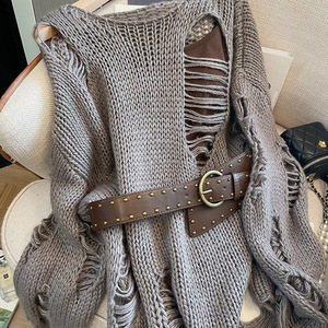 秋季时尚外穿宽松慵懒针织上衣女美式辣妹复古镂空配腰带长袖毛衣