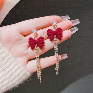 s925银针耳钉红色蝴蝶结耳环气质小众流苏耳钩毛绒轻奢高级感耳钉