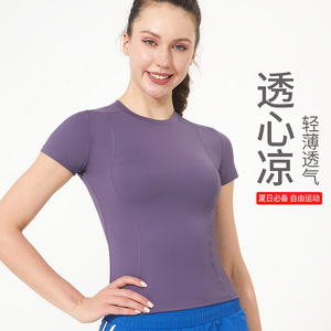 夏用薄手ヨガウェア、半袖Tシャツ、女性用ランニングフィットネスウェア、速乾ウェア、スポーツトップス、タイトフィットアウターウェア、クロスボーダー