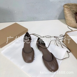 Haute Couture 2025 ニッチな新しい本革ラウンドトゥレトロ浅い口ストラップフラット中空つま先サンダル女性用