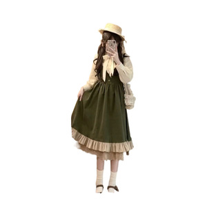 两件套学院风春秋连衣裙女高腰显瘦超仙蕾丝古着公主背带裙+衬衫