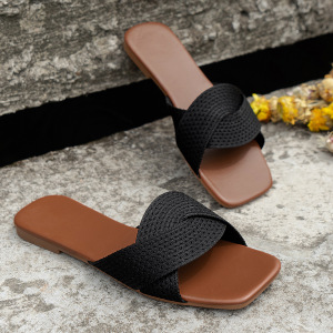 夏の交差帯の四角い布面の一字は2025の新型の対外貿易の平底の砂浜のスリッパの女性の大きいサイズの冷たいスリッパを引き延ばします。