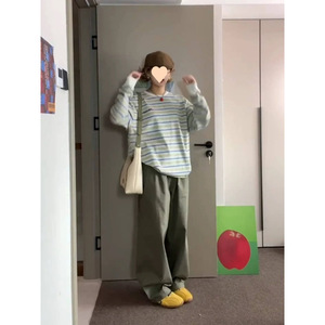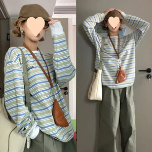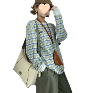 条纹正肩长袖恤女春秋季设计感小众打底衫内搭体恤宽松上衣外穿
