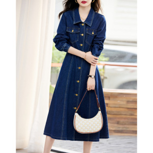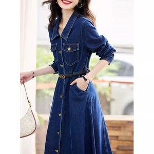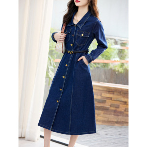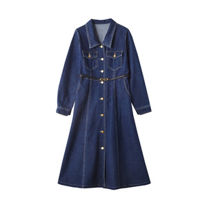 襟のデニムのワンピースの女性の春秋の新型の復古の通勤の気質は腰を収めてやせているデニムのスカートのポケットのスカートを現します。