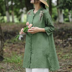 春と夏の女性のための綿とリネンの刺繍シャツ新しいルーズミッドレングスカジュアルシャツ多用途で快適で通気性のある薄いジャケット