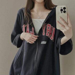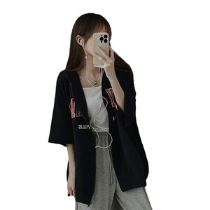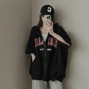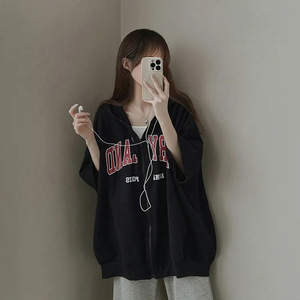 国境を越えた卸売り半袖黒のガーディアン女性2023春夏韓国風運動ゆるいフードのジッパーのカーディガン