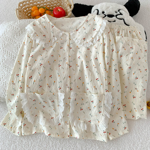 韓国系のさくらんぼの小さい花の子供の襟の雲の綿のパジャマの女性の春秋の金の甘い家の服のスーツは実際に卸売りをたたきます。