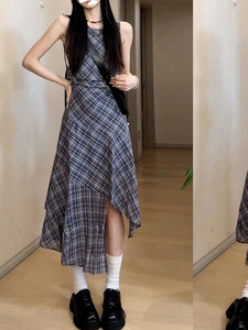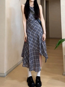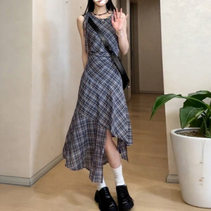アメリカンレトロチェック柄ノースリーブドレスレディース夏新作ニッチデザイン不規則ベストスカートミドル丈
